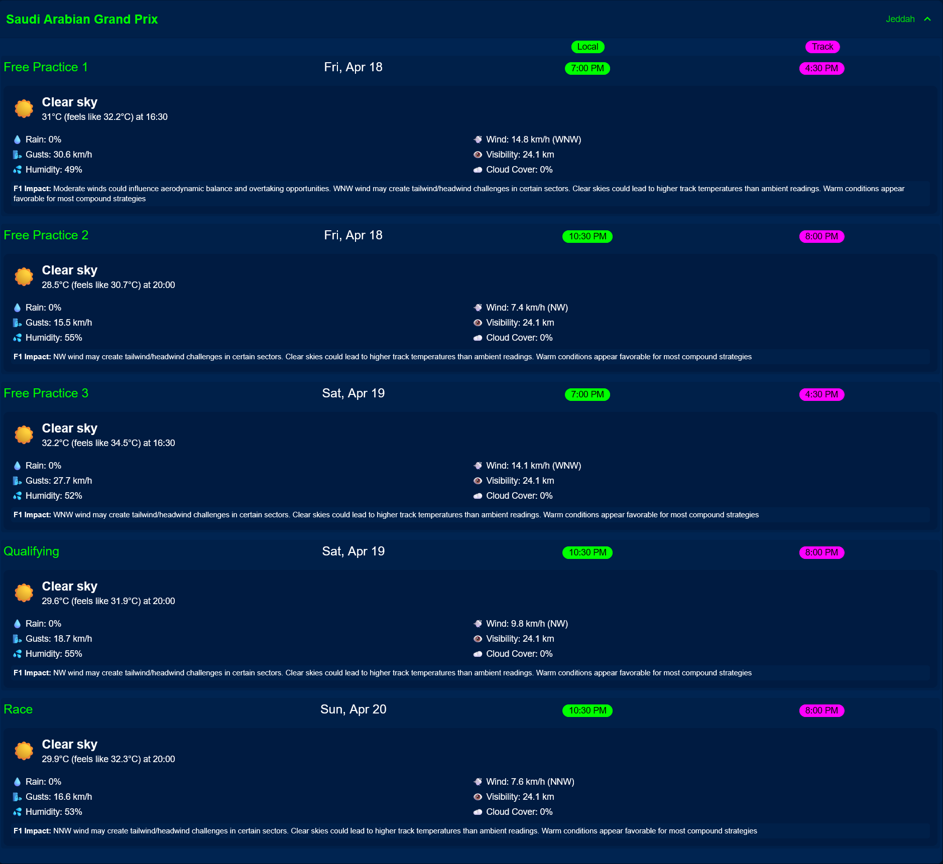 Temperature and Humidity: The move to an April date for 2025 might bring conditions closer to summer levels (warmer, more humid) than the previous March races. The provided text includes a forecast for a race weekend (potentially referring to the 2025 event contextually) predicting highs of 37/38°C and lows of 27°C. Such heat, especially on the narrow track with barriers limiting airflow, could make daytime practice sessions (FP1, FP3) punishing and the evening sessions (FP2, Qualifying, Race) uncomfortable for drivers over the ~1h20m race duration. Heat also adds stress to car components like brakes.